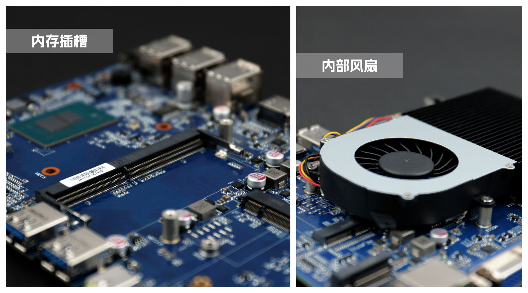918博天堂(中国区)官方桌面云终端Y-BOX S2主板中部是内存插槽,采用单通道笔记本内存槽设计,最大支持容量可达32GB,最高支持DDR4-3200MHz频率,横插的形式可以减少主板的占用体积,使整体机身更紧凑,内存顶部的风扇起到高效散热的作用。