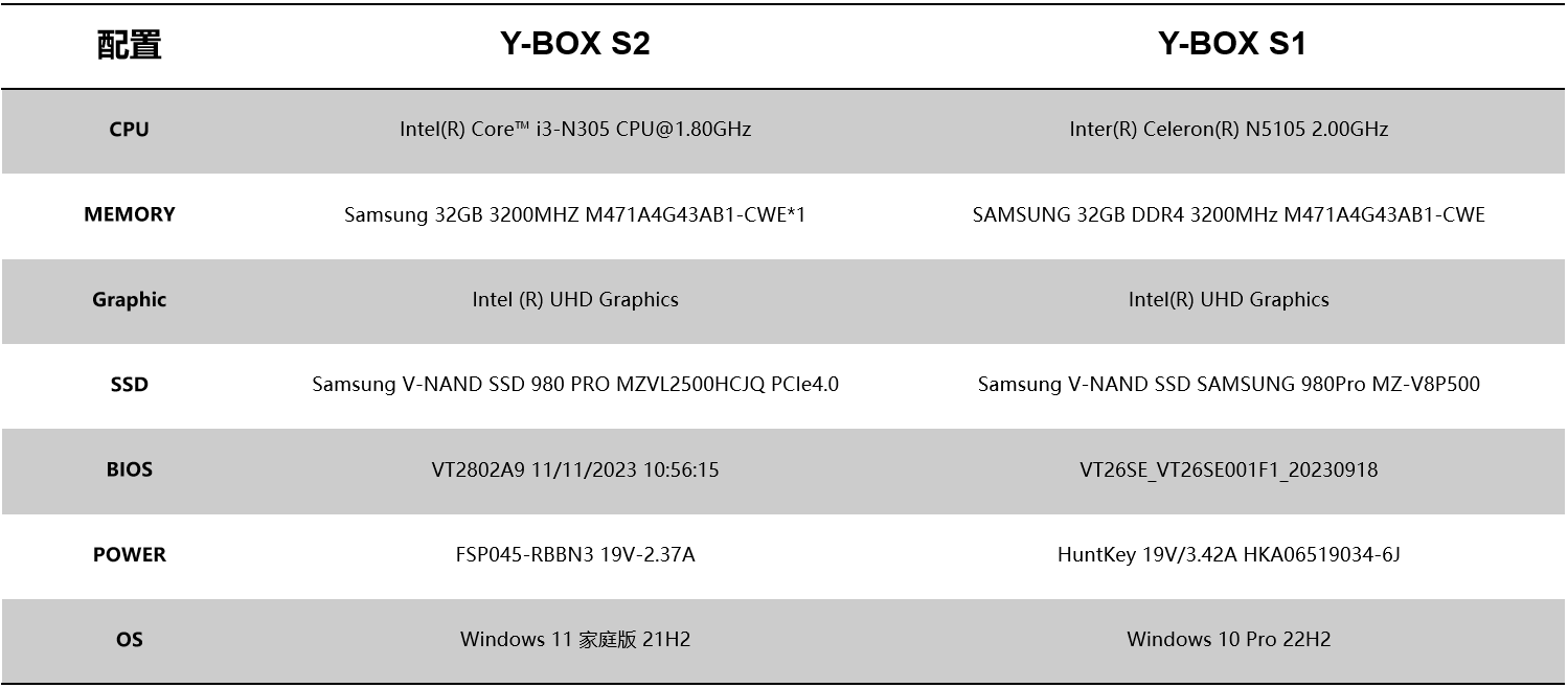 针对桌面云终端Y-BOX S2的测试项目中,最值得关注的是性能测试的跑分数据和稳定性测试内容,这能直观影响主机在使用过程中的稳定性和用户的使用体验。针对性能测试,918博天堂(中国区)官方选择了将Y-BOX S2与前一款更迭产品Y-BOX S1进行对比分析,Y-BOX S2支持Intel® Alder lake-N处理器,Y-BOX S1支持Intel® Jasper Lake,并分别选取了以下配置: