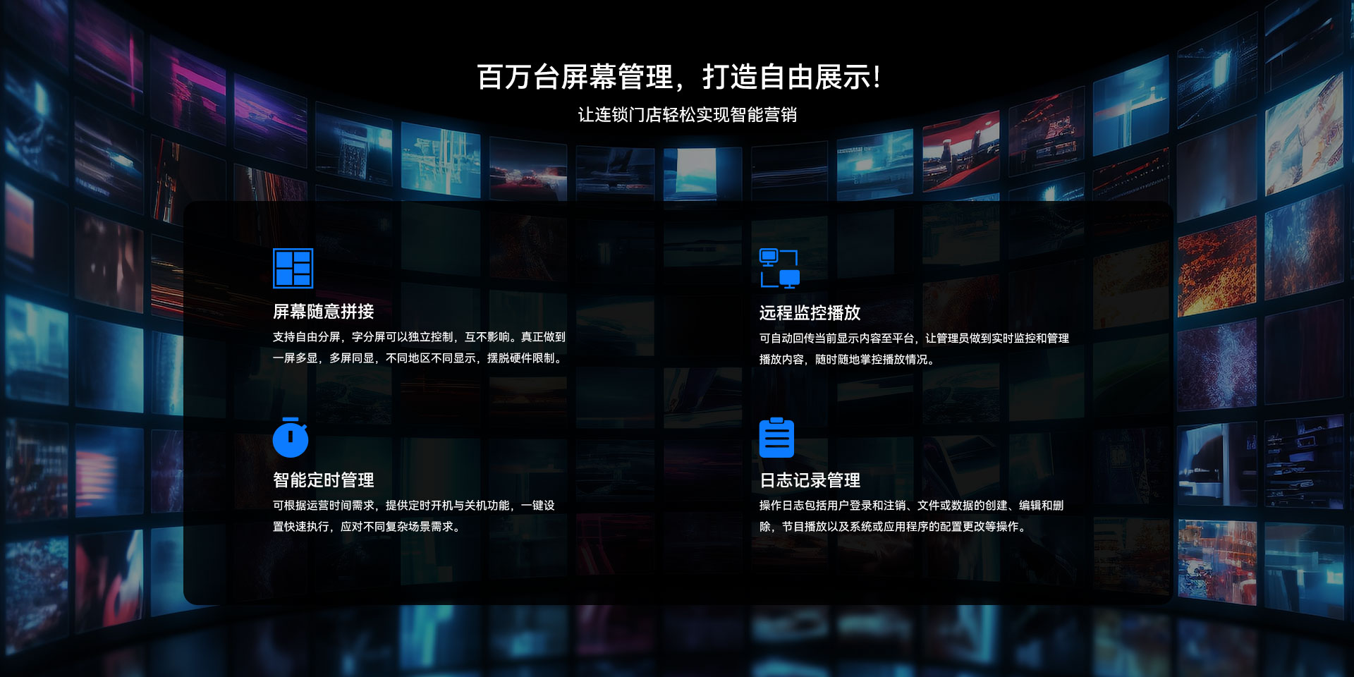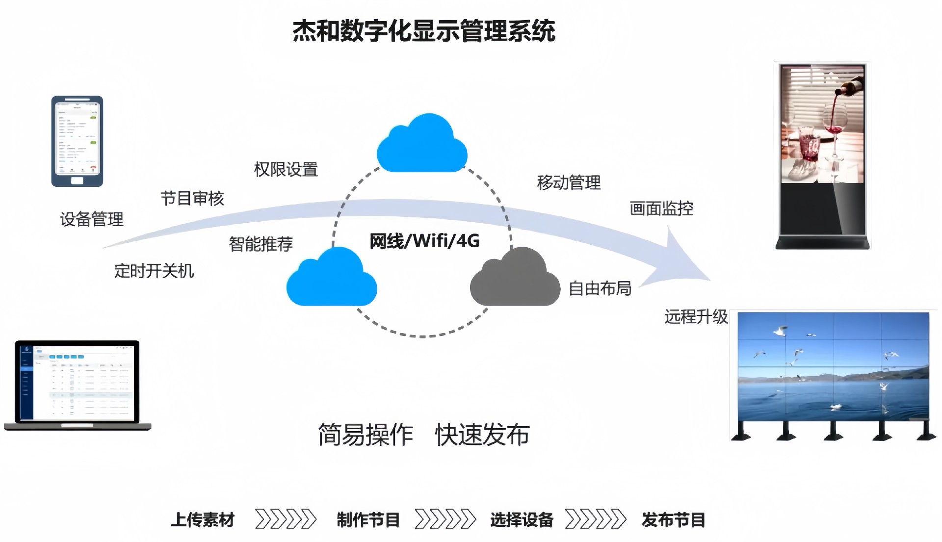 目前918博天堂(中国区)官方科技GDSM-ES系统覆盖市场上多形态网络智能显示终端,满足行业全产品业态需求,如广告机、LED显示屏、LCD拼接屏 、普通液晶电视等各种显示终端,广泛用于广告宣传、通知公告、指示引导。