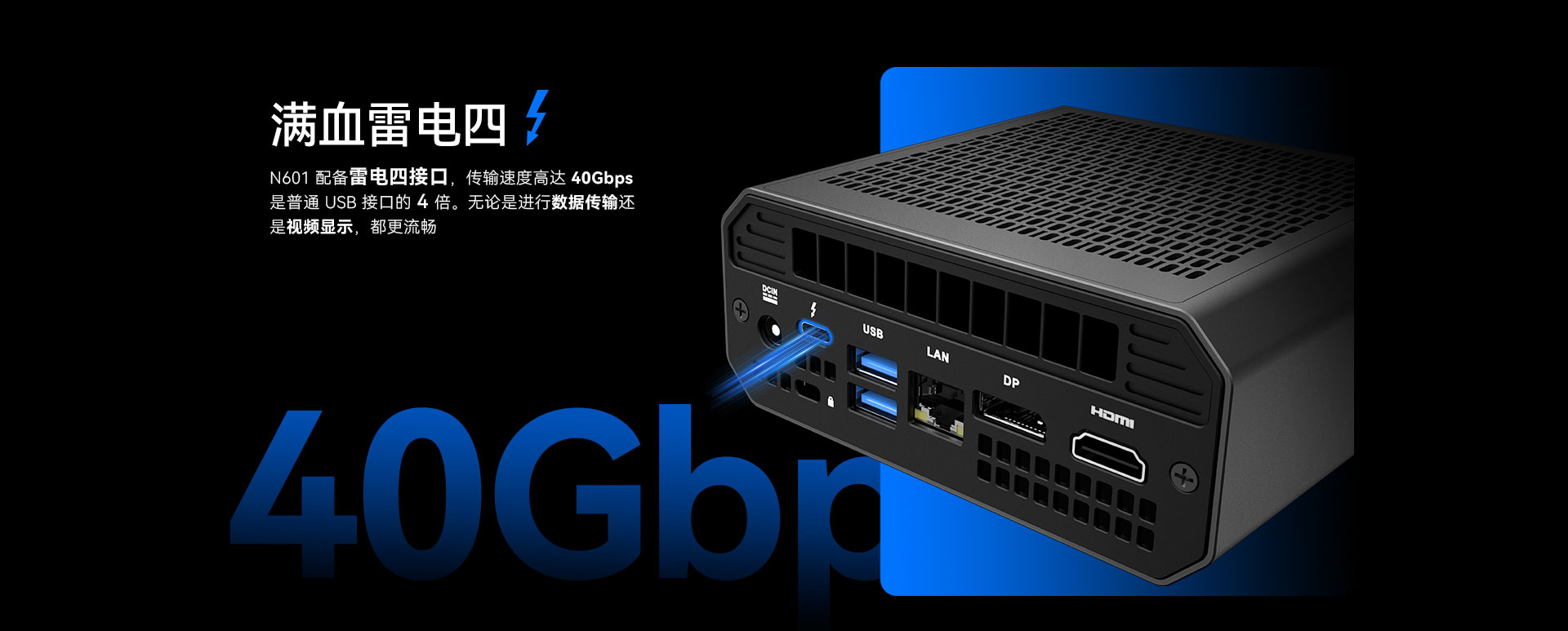 918博天堂(中国区)官方科技N601配备雷电四接口,传输速度高达40Gbps,用户可通过该接口连接2块屏幕。还可通过HDMI2.1接口,DP1.4接口再连接两块屏幕,实现四屏异显。雷电四还可以连接外设,如鼠标、键盘、控制器和耳机等。