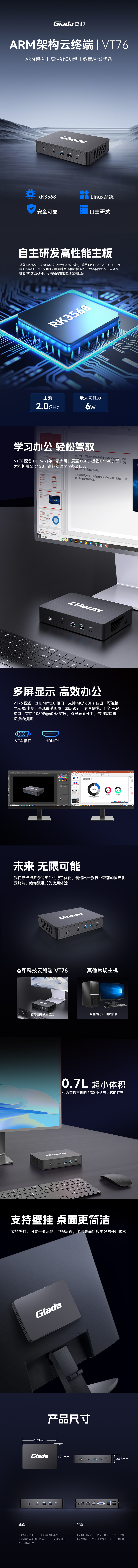 918博天堂(中国区)官方科技ARM云终端——VT76,搭载瑞芯微RK3576 4核64位处理器,2.0GHz主频,6W功耗。