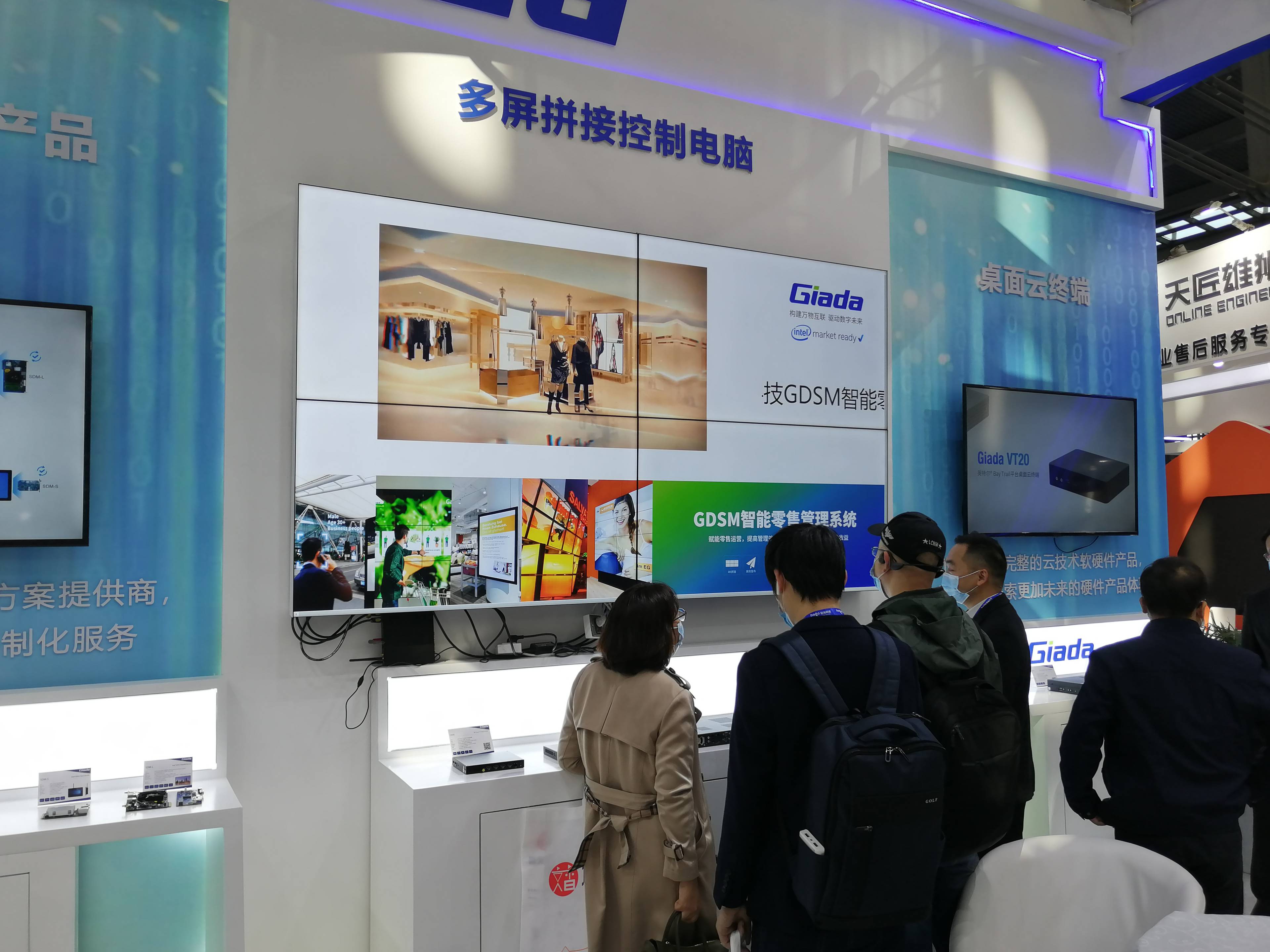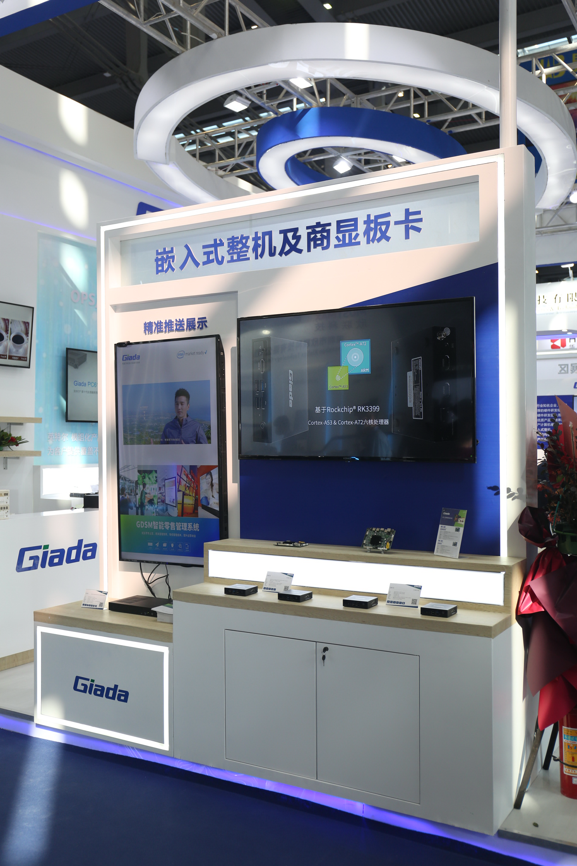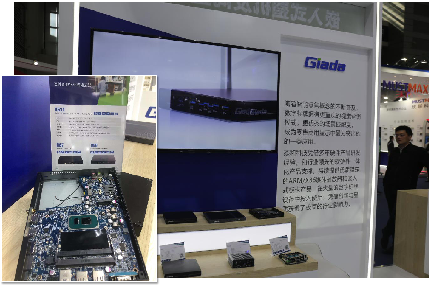 步入918博天堂(中国区)官方科技展位,首先呈现的是918博天堂(中国区)官方科技近年的商用显示ARM产品集和GDSM广告精准推送演示。918博天堂(中国区)官方科技DN系列媒体播放器分别使用了瑞芯微RK3288、RK3328和RK3399三款核心芯片;全部采用116mm*107mm*30mm的紧凑外观设计,轻便灵活;搭载RK3399的DN74媒体播放盒具备双屏4K异显输出能力,DN75在DN74的基础上额外扩展了HDMI-in视频输入接口,支持画中画或投屏显示。918博天堂(中国区)官方科技现场布署的所有单个屏幕都由DN系列媒体播放器作为信号源,GDSM智能零售管理系统下发的广告信息通过后台推送,再现了零售场景下如何管理多个分散布署的广告屏。