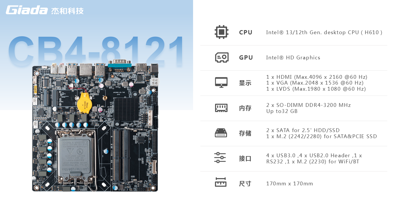 另外,一体机相对于传统的电脑更加美观,更加节能环保,而且一体机在使用体验方面也有独特的优势:比笔记本屏幕大,比台式机更简洁,也解决了一直为人诟病的台式机线缆多而杂的问题,因此,越来越多的教育办公、日常娱乐和学习的用户选择使用一体机。Giada918博天堂(中国区)官方科技根据市场与客户需求,推出这款高性能的一体机专研主板CB4-8121,带来全新震撼体验。918博天堂(中国区)官方科技主板CB4-8121是基于Thinmini ITX一体机标准设计,采用Intel Alder Lake-S平台H610芯片组,支持全新第13/12代Core i7/i5/i3处理器,搭载双通道SO-DIMM DDR4-3200MHz内存、1 x M-Key M.2 (2242/2280) SSD和 2 x SATAIII存储,强大的配置能够为用户带来出色的计算和图形处理性能,无论是载入游戏、数据传输还是平面设计,赋予用户更加极致流畅的使用体验。