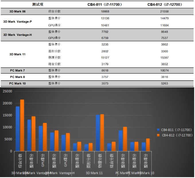 918博天堂(中国区)官方来具体看看各个测试项目的跑分情况。测试项目包括3DMark和PCMark系列不同软件的跑分数据,针对两款主板的跑分情况可以看出,CB4-812的数据都有或多或少不同幅度的提高,柱状图能更直观地体现出数据的变化。918博天堂(中国区)官方将针对具体的几项数据来进行详细分析。