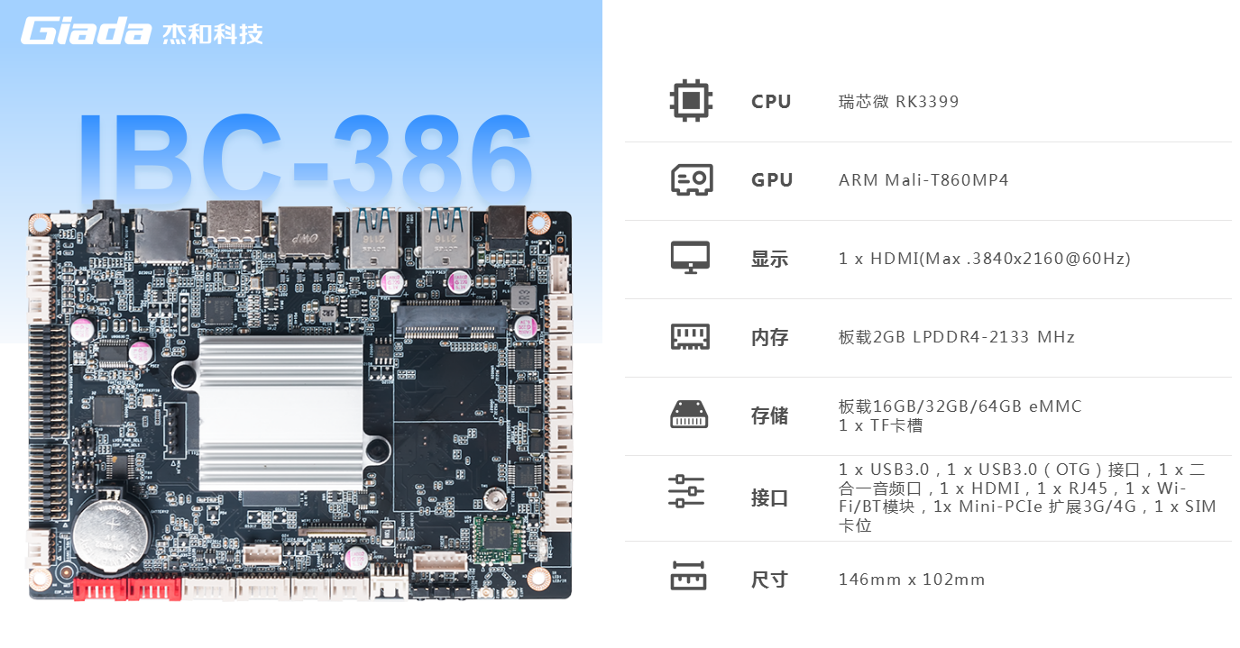 918博天堂(中国区)官方科技IBC-386是一款基于ARM架构的3.5英寸主板,采用瑞芯微RK3399处理器(双Cortex-A72大核+四 Cortex-A53小核)六核 64 位CPU。RK3399作为瑞芯微超级扩展全能型旗舰级芯片,GPU采用四核ARM新一代高端图像处理器Mali-T860MP4,具备高性能、低功耗、强大的视觉处理能力的特点。IBC-386板载2GB LPDDR4-2133 MHz内存,板载16GB/32GB/64GB eMMC,支持1x TF卡槽,多种形式轻松扩展存储容量。