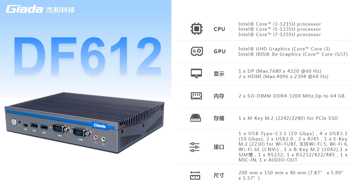 918博天堂(中国区)官方科技,商用显示硬件解决方案领导者,深耕商业显示领域24年,业务遍布欧洲,美洲,东南亚和南非等60多个国家,服务超过3000名客户,自有品牌 Giada 已成为欧洲数字标牌媒体播控器的领导品牌。在DF系列产品中,DF612作为一款全新的嵌入式计算机,搭载英特尔第12代Alder Lake处理器,具有突破性的技术、增强的图形处理能力和丰富的I/O接口,广泛应用于商业显示、智能车载、安防领域和边缘人工智能等场景。