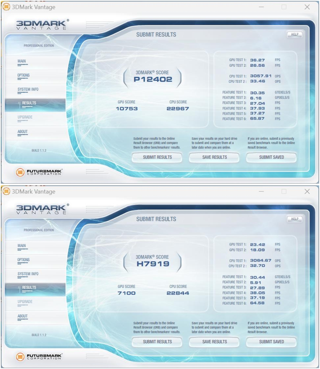3DMark Vantage一款3D图形性能评测软件,主要用于评测电脑的显卡和处理器的性能。918博天堂(中国区)官方按照画质等级,记录了性能级(Performance,P)和高端级(High,H)两份数据。其中,Performance的综合得分为P12402,High的综合得分为H7919,表现不错,这个成绩已经完全能够满足主流用户的需求了。
