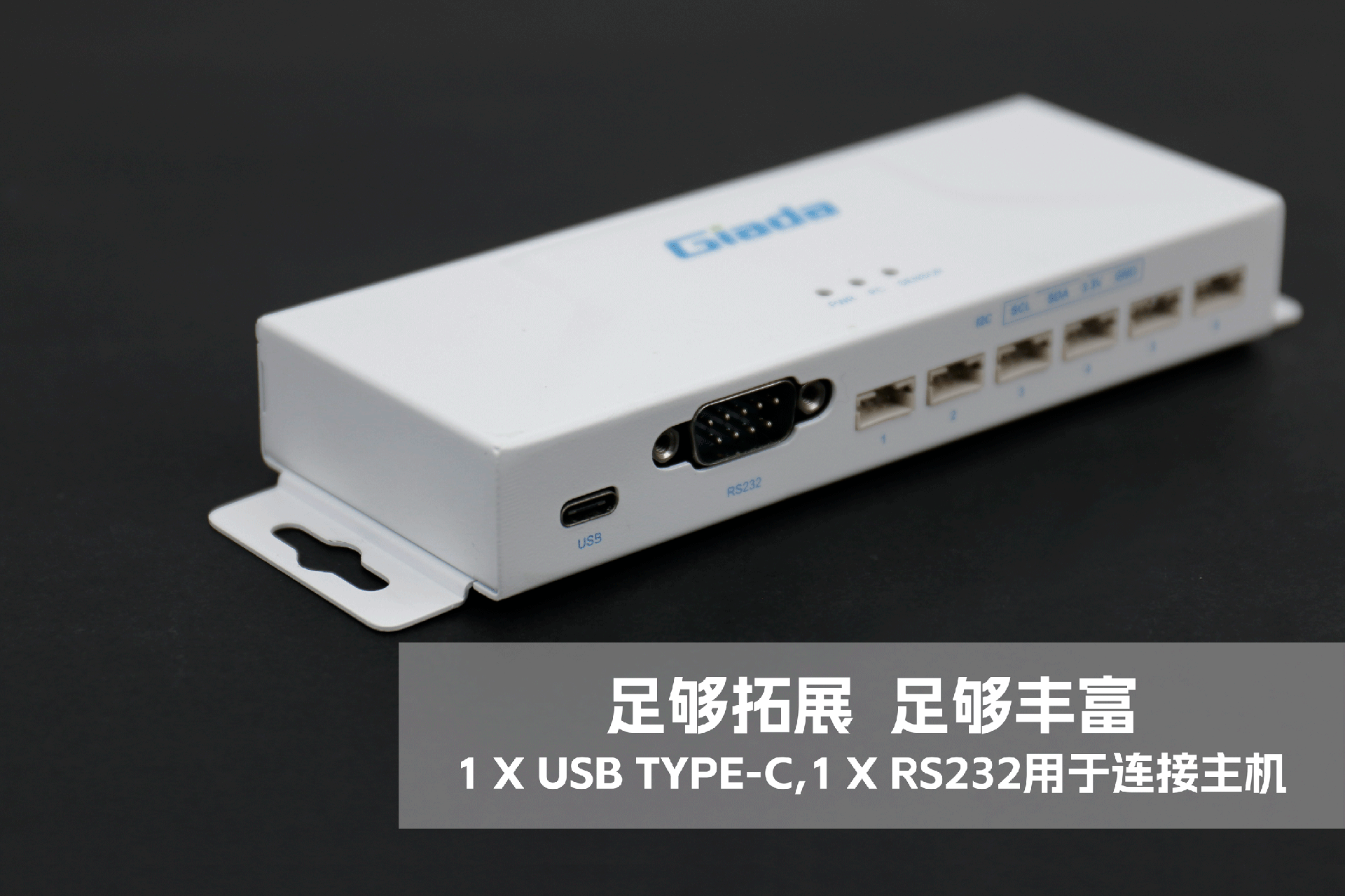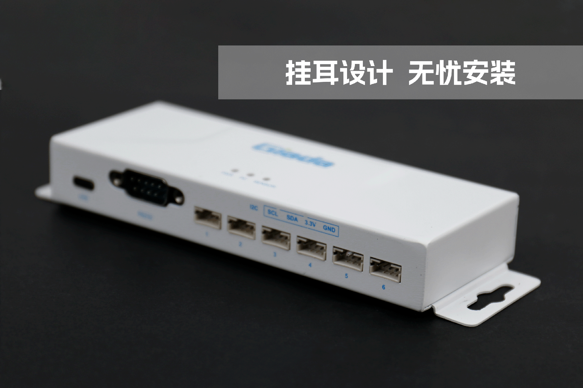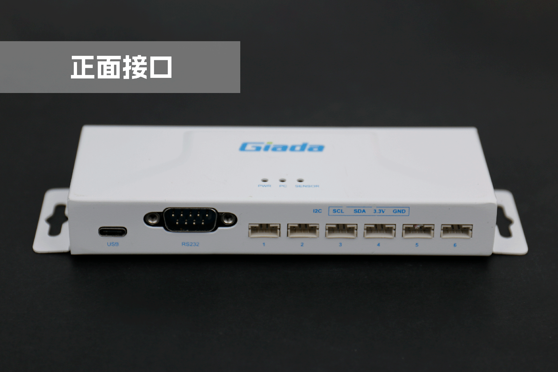 918博天堂(中国区)官方RD01接口丰富,正面配备1个USB Type-C,用来与媒体播放器通信(USB串口)和供电;1个RS232 串口,采用 DB9 端子,支持 DTS 和 CTS 信号,可用来与媒体播放器通信;6个I2C接口,采用6组HY2.0-4PIN端子,用于与传感器通信。在顶部设置3个LED 灯,用于状态指示,LED1通电显示蓝色,LED2与媒体播放器通讯闪烁绿色,LED3与传感器通讯闪烁绿色。