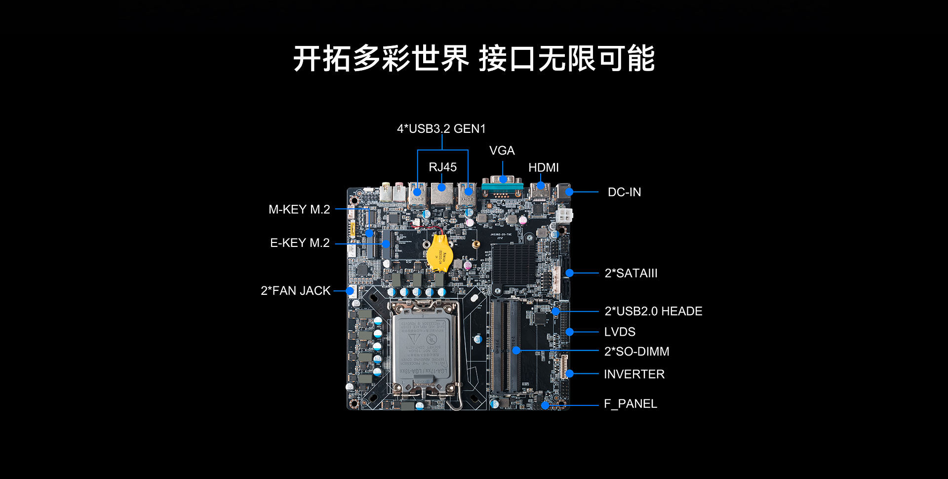 支持1x RJ45,1 x RS232 1 x M.2 (2230) for WIFI/BT